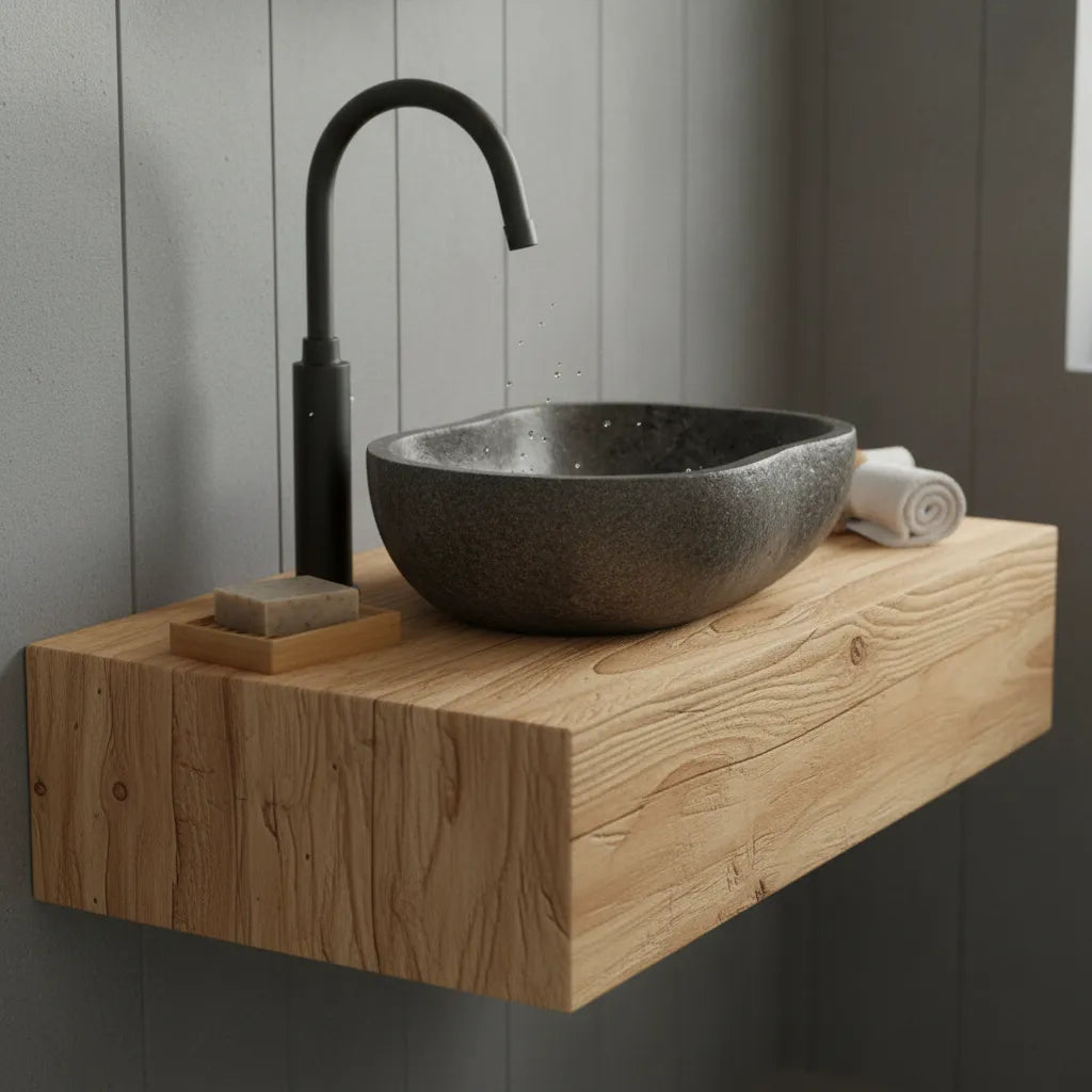 -Esculpida em pedra natural River Stone ( pedra do rio ), de origem vulcânica, sua matéria prima é encontrada apenas na Indonésia, bem como os artistas que esculpem estas incríveis cubas para banheiro ou lavabo.