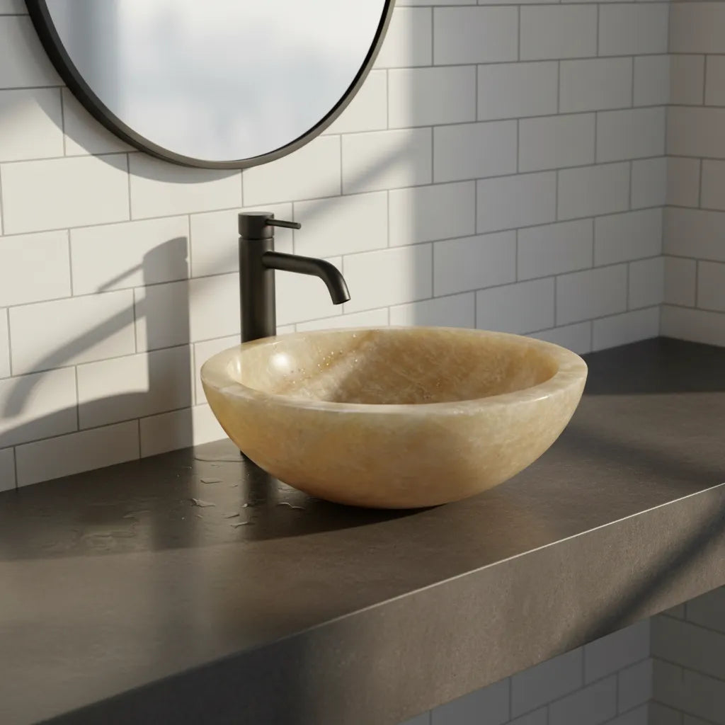 -Esculpida em pedra natural Ônix, com origem sendo do sudeste asiático, sua matéria prima é encontrada apenas na Indonésia, bem como os artistas que esculpem estas incríveis cubas para banheiro ou lavabo.
