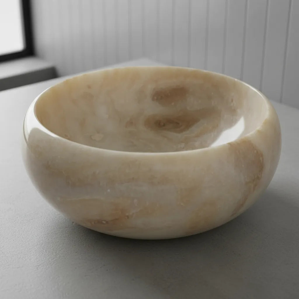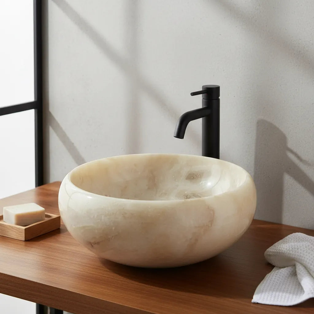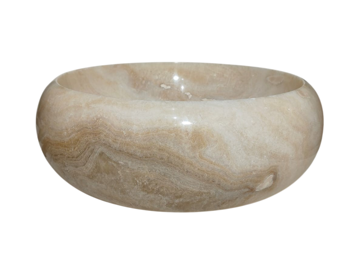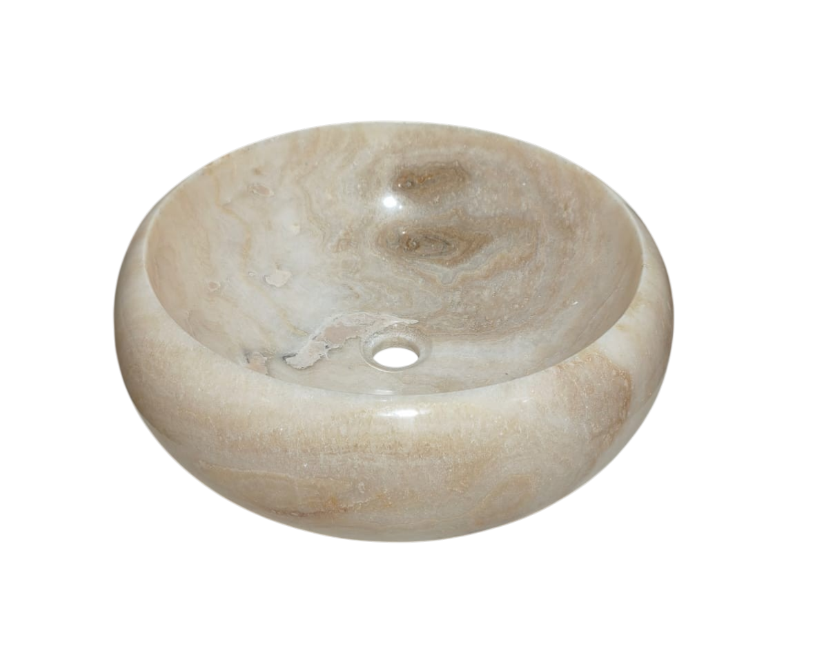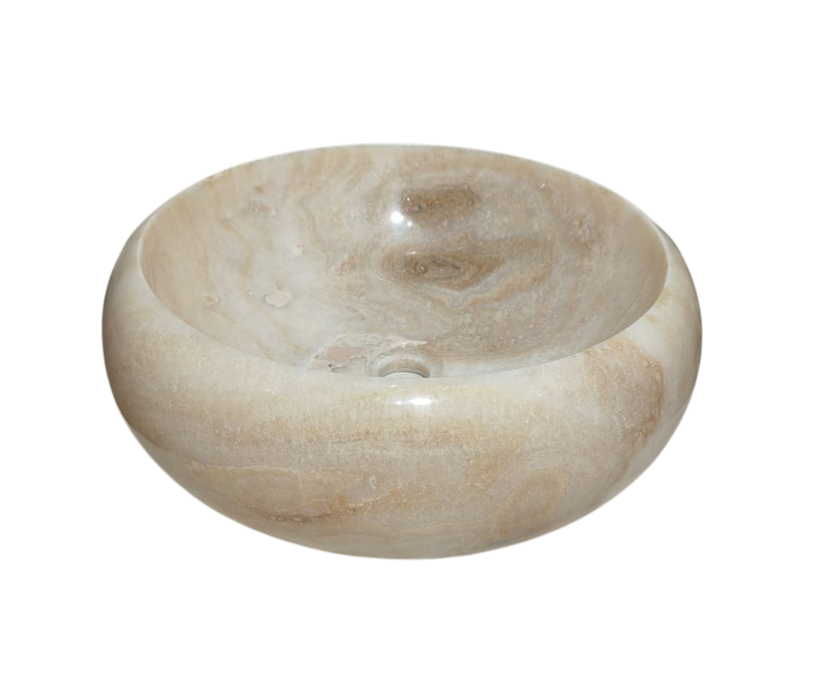 -Esculpida em pedra natural Ônix, com origem sendo do sudeste asiático, sua matéria prima é encontrada apenas na Indonésia, bem como os artistas que esculpem estas incríveis cubas para banheiro ou lavabo.