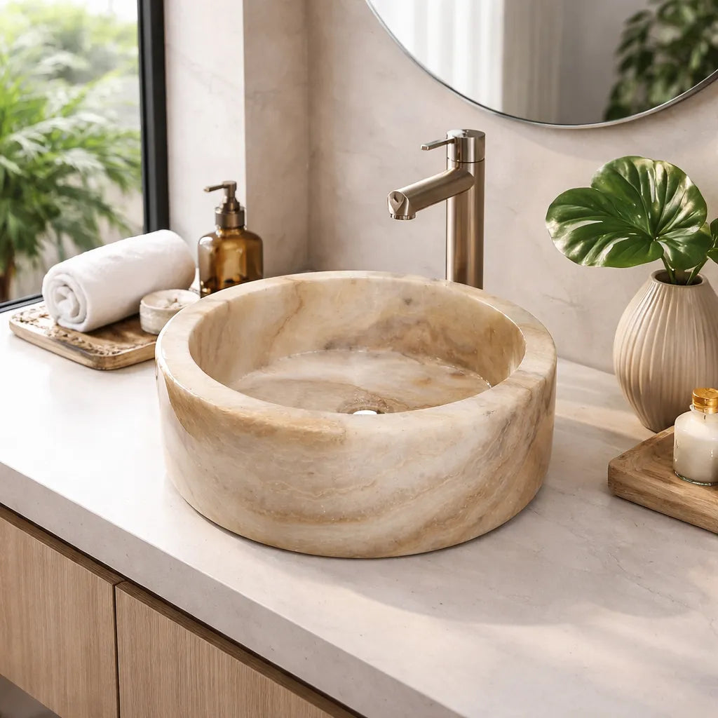 -Esculpida em pedra natural Ônix, com origem sendo do sudeste asiático, sua matéria prima é encontrada apenas na Indonésia, bem como os artistas que esculpem estas incríveis cubas para banheiro ou lavabo.